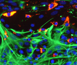 Canine olfactory ensheathing cells (transplant population) genetically engineered using functionalised magnetic nanoparticles. Target protein (green), photo Alexander Delaney |