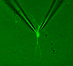 Single cell electrical recording from a nanoengineered primary cortical neuron, photo Arwa Shakli and Mike Evans |
