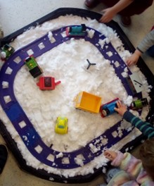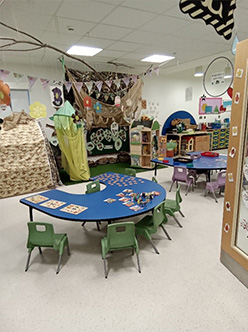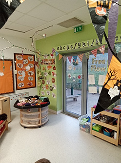 We try to get outside daily either on the large playground where we can run & use large motor skills or our free flow area which is set up daily with a range of toys. Each area of the EYFS is covered.