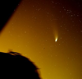 Hale-Bopp through the slit of the Thornton Telescope [No telescope; photograph taken on colour film; note the light pollution in the North Staffs sky] |