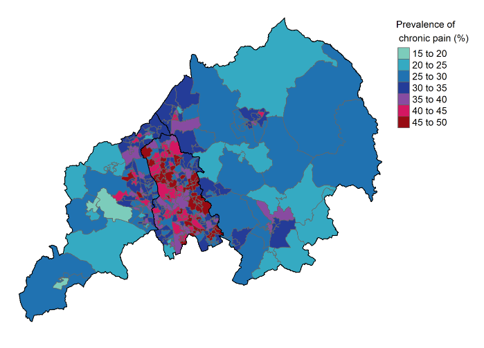 - The map shows the proportion of people in each area who have experienced chronic pain. That is, they have experienced pain in any area of the body on most or all days during the past 6 months. The proportion for areas ranged from 18.6% and 50.1%. On the map the lighter areas are where around 1 in 5 people experience chronic pain. In the darkest red areas almost 1 in 2 people experience chronic back pain.
