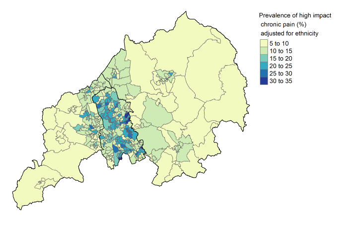 - The map shows the proportion of people in each area who have experienced high impact chronic pain. That is pain that impacts on their activities on most or all days during a six month period. The proportion for areas varies from 6.2% to 33.1%. On the map the lighter areas are where between 1 and 20 and 1 in 10 people experience pain impacting on daily activities on most or all days. In the darkest blue areas almost 1 in 3 people experience pain impacting on daily activities on most or all days.