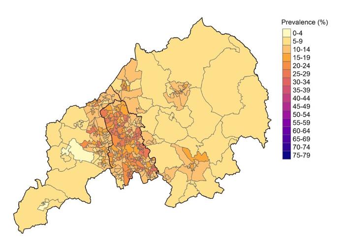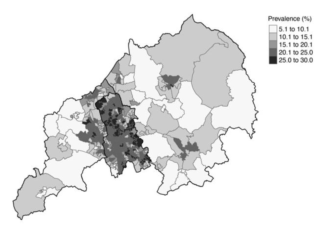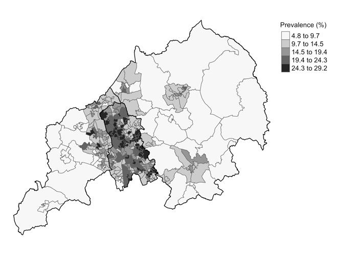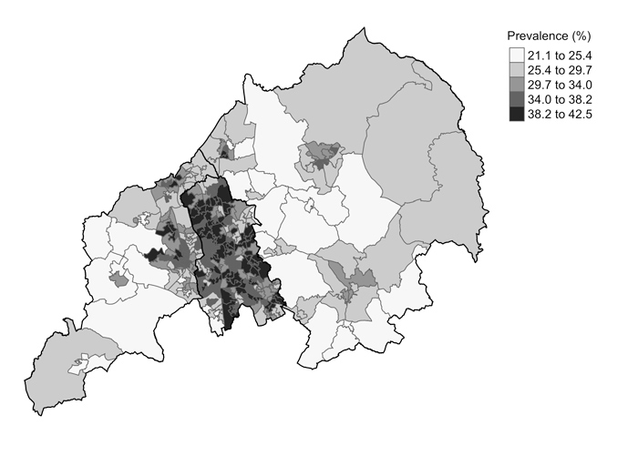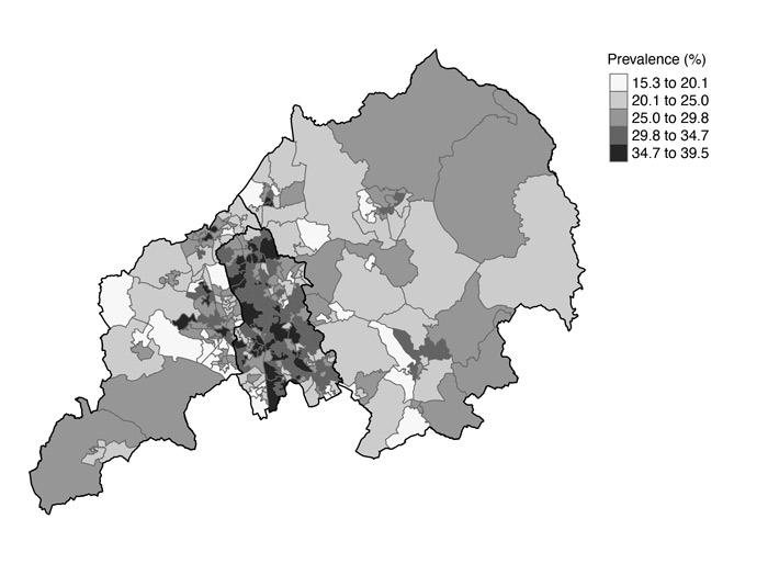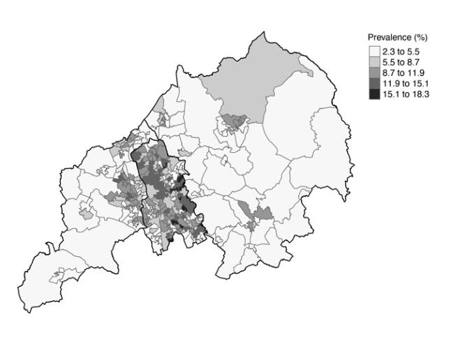 This extra version of the map is tailored to show the difference in depression between neighbourhoods more clearly. Depression is most common in the areas shaded in the darkest grey. Depression is least common in the areas shaded in the lightest grey.