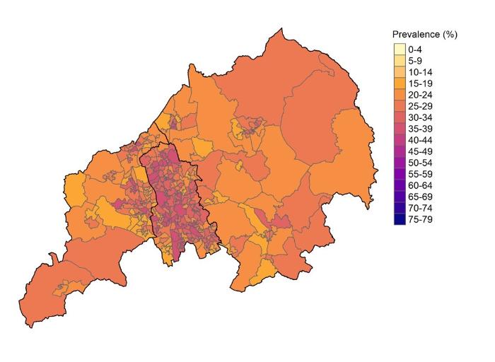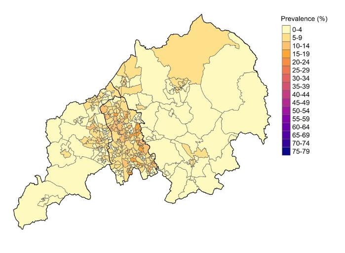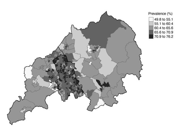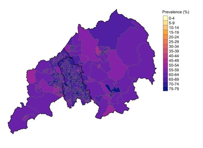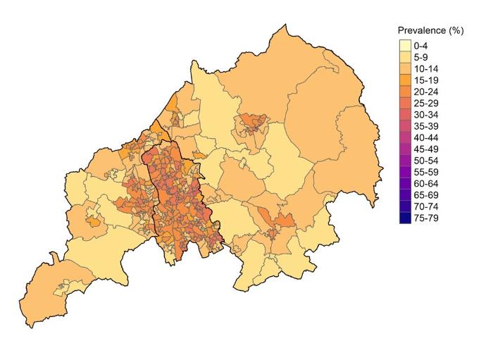 This extra version of the map is tailored to show the difference in anxiety between neighbourhoods more clearly. Anxiety is most common in the areas shaded in the darkest grey. Anxiety is least common in the areas shaded in the lightest grey.