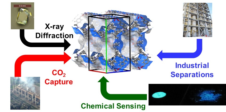 Research in the Hawes group is based around synthetic and structural aspects of supramolecular coordination chemistry, and the synthesis of responsive materials, with a particular focus on Metal-Organic Frameworks (MOFs). Our goal is to synthesise and characterise new crystalline materials with functionality controlled by the design of the organic ligands. These materials have numerous uses, but our focus is on developing water-stable materials for chemical separations (separation of liquid or gaseous hydrocarbons, and CO 2 capture), and chemical sensing with fluorescent or colorimetric MOF-based sensors. This research heavily involves single-crystal X-ray diffraction to probe the fascinating structural chemistry of both discrete and polymeric coordination compounds. As well as a large synthetic chemistry component, our research involves a wide variety of physical and spectroscopic characterisation techniques. These projects are fundamentally interdisciplinary, with support from international collaborators, and geared towards new research directions both in fundamental science and applied towards pressing environmental needs.