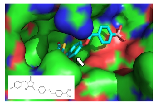 Above: The image shows the x-ray structure binding of the potent inhibitor HA155 to the enzyme target. A delivery molecule was attached at the position indicated with an arrow to improve the pharmacokinetic properties of the inhibitor.
