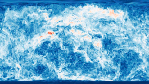 Vertical cross-section of the turbulent flow inside a star where carbon fusion at the bottom of the image makes the plasma buoyant and drives turbulence. The colour indicates the speed of the plasma.