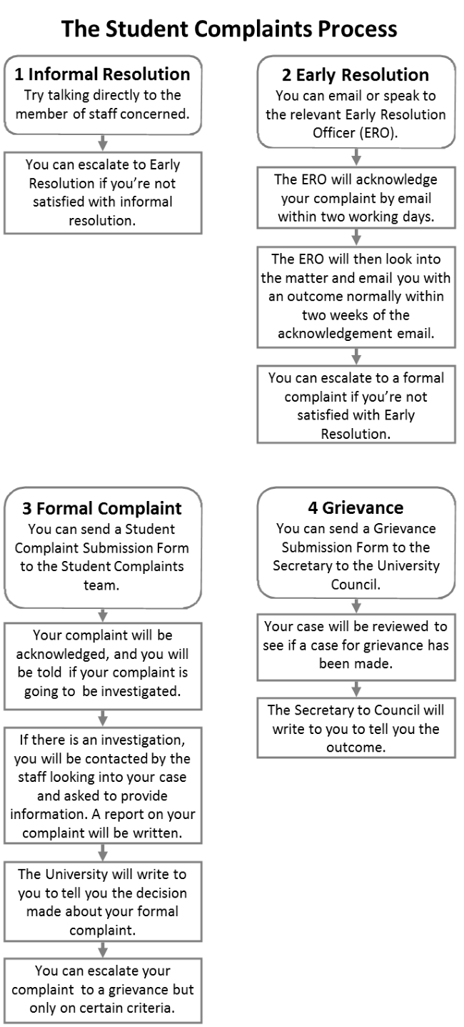 You can first try and resolve an issue informally with the member of staff or team involved, but if that doesn't solve the problem, you can speak to the Early Resolution Officer for the School or Service in question. The Early Resolution Officer can look into your concern and provide you with a response. If Early Resolution doesn't solve the problem, you can then make a formal complaint to the University. There can also be times when Early Resolution is not suited to a particular problem. A formal complaint may include an investigation and at the end the University will write to you to let you know the result. If your complaint is not investigated, we will write to you to explain why, and to confirm any decisions made about your complaint. If this doesn't resolve the matter, you may be able to submit a grievance to the Secretary to the University Council, subject to certain criteria, and have your case reviewed.