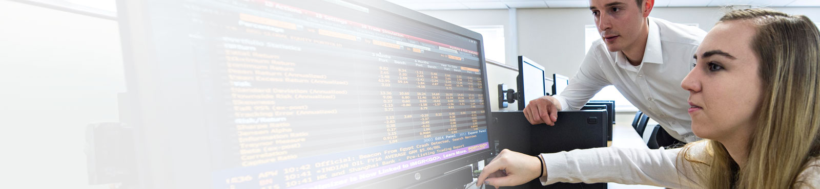 You will have access to our Bloomberg Lab, set up like a trading room, where you can gain hands-on experience using Bloomberg Professional Service, also known as the Terminal. This software is widely used in the financial industry, making skills in its use highly valued by employers. The Terminal provides privileged access to economic, financial and business real-time data, world news, analysis and reports from some of the world’s biggest financial organisations. You can also utilise the lab in your own time, to gather data for your studies and demonstrate to prospective employers that you have expanded your financial market knowledge by completing the Bloomberg Market Concepts, a free e-learning course available to Keele Business School students.