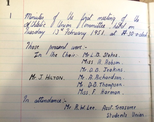 Photo right: Athletic Union Minutes Book - Page 1 1951 - the very first meeting of the AU, 13th February 1951.