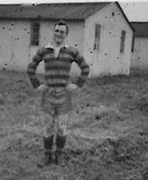 Photo right: This photo must be one of the earliest of a Keele rugby shirt. This is Ron Decker (1954), an American exchange student to Keele from Swarthmore, 1953-1954. I wonder whether he attempted a forward pass?