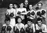 Keele Boxers with their inspirational coach Sam Pearson (a professional boxer in the 1930s). Among the students are Phil Edmondson (1959), Mike Steele (1958) and Terry Prince (1958). At 6'5" Sam Pearson was known as a gentle giant; he had fought bouts with Primo Carnera and later became Chair of the North Staffordshire and South Cheshire Ex-Boxers Association.