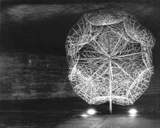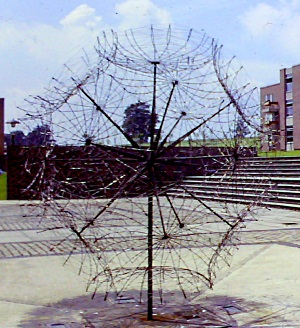 "I took a number of photographs of the Dandelion during my time at Keele (1959-63 and 1963-65) including from the top of O Block and a particularly spectacular one at night. It was floodlit from below with four small rectangular lights. When I returned one year for a reunion I was very disappointed to find that it had been cut down. I understand that this was after someone had run into it during a game of football in the quadrangle and his head had got shredded. Health and Safety! A pity… I thought it was beautiful. It was not made of stainless steel. I think it was welded steel wire. It rusted."