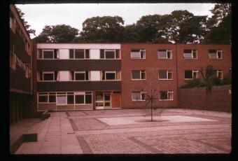 "Going through old papers, I came across this photo. You will be able to place where the sculpture stood. I'm afraid I can't remember the names of those buildings even though I lived in one in my first year! Nor do I know the artist's name, though he was local as far as I recall. I'm pretty positive the photo was taken in 1960.”
