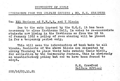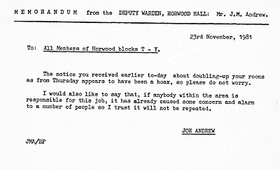 "Here is copy of the hoax message (left) sent to residents of T to Y blocks in Horwood Hall on 23 November 1981. The hoax memo suggested that we were all to be double up in bunk beds due to university cuts and to put out our single beds for collection. No one did but there were many concerned enough to contact the wardens and residential office leading to the official memo the same day. I don't know who was behind it - it might have been part of a campaign to raise awareness of the savage UGC cuts being imposed on the university that were putting the unique Foundation Year programme in jeopardy. Here is also (below) the official memo sent in reply by Deputy Warden - later Professor."