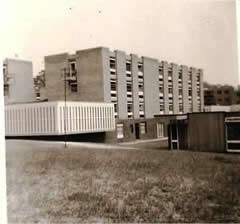 "When the library was opened in the early 1960s we all thought the little lions on top and the pole with an open book which was in front between the tow sets of steps were pretentious and not at all in keeping with the campus architecture (which was still army huts, mostly). The lions were soon crowned (my memory says with top hats, but chamber pots may have suited better) and the pole adorned with a red painted stripe going round it like a barber's pole. Unfortunately the paint soaked into the pole and could not be removed so that was the end of that expensive piece of sculpture."