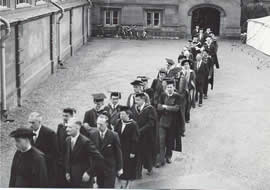 During the busy buildings years, of the ‘50s and ‘60s, opportunistic students were supplied inadvertently with the building materials to “redesign” the campus. It is possible that the entrance to the courtyard and hence to Keele Hall was blocked up on more than one occasion. Certainly I remember it being blocked up some time in the first four years (1950-54). This was done with bricks on a Saturday night; leaving a small gap low down through which Lord Lindsay and a visiting dignitary had to crawl through on the Sunday morning. Lord Lindsay was less than amused! One of the perpetrators was the late Ron Ferrans (1954), a good pal of mine."