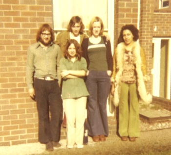 Photo below left: Residents of Hawthorns F Block in 1973: Paul Stevens, Stephen Pask, Stephanie Croxton, "Nonney" and M Morling