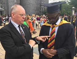 Photo below: John Easom (1981) explains the colours of the SU tie, also used by the AU, to Imi Agboaye (2017) on Imi's Graduation Day, 2017.