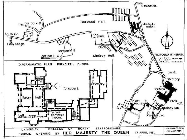 A plan designed for the formal opening of the University College of North Staffordshire by Her Majesty the Queen, 17 April 1951. The main feature is clearly Keele Hall itself - with the Library and Refectory integral. The Students' Union block comprises three large military Nissen huts. Horwood Hall comprised military huts for men and Lindsay Hall likewise for women. All students were required to live on campus for all four years of the original UCNS at Keele degree.