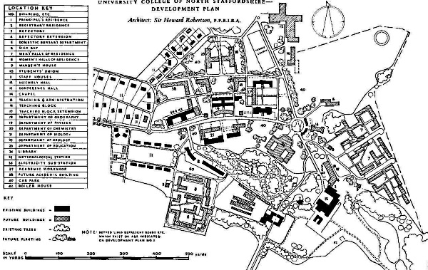 This plan is drawn with the eye of imagination. A development plan was proposed with an amazing range of new buildings, few of which appeared or as drawn. The Library is prominent in the centre with its curved frontage. The Students' Union is small and peripheral to the many grandiose teaching buildings. The high number of staff houses reflects the original ideal that all staff, as well as students, were expected to reside on campus as a community of scholars. The early concept of a quadrangle, similar to an Oxbridge College or an American Liberal Arts College, which began with the early construction of the Tawney and Walter Moberly Buildings (Conference Hall) has been abandoned.
