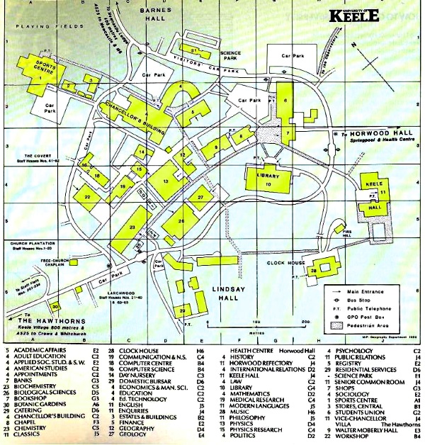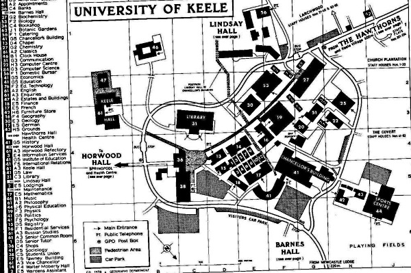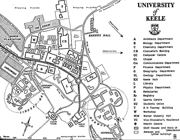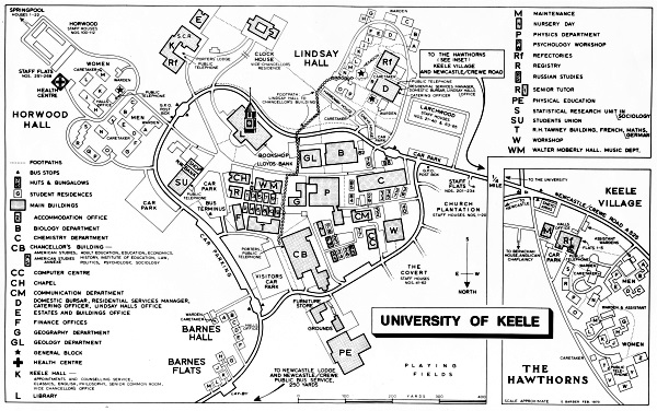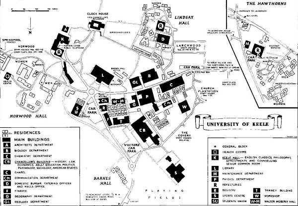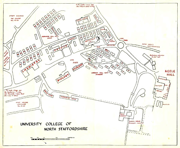 This plan from the SU Handbook predates the building of the Chapel (1965), Students Union Building (1962) and Library (1962), all of which came after the award of full University status. The residences, still housed in wartime huts, are prominently marked so new students could find their homes - although Sneyd House and Harrowby House, the first blocks of the new Lindsay Hall for women have been built. The Conference Hall (Walter Moberly) has pride of place centrally as all FY lectures were held here, along with musical, dramatic and other performances - and most large public events.