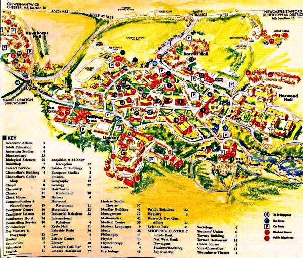 This Keele "Risk" map was drawn by the ebullient Mark Holtz, Class of 1993 in about 2012. It looks like Campus is the continent you need to win - although Hawthorns generates the most extra armies! But the Expansion site or development site is a major feature in green. Home Farm is on the verge of becoming the new Sustainability Hub, and Mark notes that the empty space beyond which began to be filled in the mid to late 2010s is called "Exciting New Stuff". Sparky stayed involved with Keele, especially the Union, and created many annual Yearbooks until his untimely death in 2016. The Pig and Rat, Lindsay Cafe Bar, Templar Bar (Hawthorns), Horwood Bar and KPA all merit their own countries! As do the Lakes. The Library is named "Learnin' Stuff".