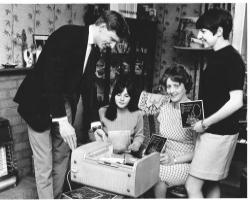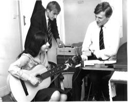 "It was a cold and foggy day – January or February 1966 – early in my second FY term. I had just got back from London and my hut mate, Phil Barber, who had been asked to play for the record but was otherwise committed, had suggested me, and offered to loan me his guitar. I was told it would be in a recording studio in Birmingham but I had no idea where it was or, more to the point, what I would be playing. I met up with Rod Goult, who was organising things, and was told that I would be driven to the studio and that we would pick up the singer on the way. I found myself more or less lying in the back of a van on top of all sorts of things and we picked up Shirley Kent en route who joined me in the back. She had composed settings for two poems by Wilfred Gibson and she sang them to me as we drove up the M6. I worked out accompaniments and by the time we reached Tetlow’s Recording Studio we felt confident that we could do the job. We went into a vast studio, big enough for a symphony orchestra, heated, or rather warmed, by a coal fire which was already dying. I had worked out a fast-picking accompaniment to ‘Back’ and wanted to get this down quickly while my hands were warm. We did it in one take and were both satisfied with it. However, Rod felt we ought to do it again a few times. We struggled on with it but the fire was dead and the studio and my hands were getting colder so there were many fumbles. We finally agreed to use our first recording but found that it had got lost. Eventually we settled on a track which has one tiny fumble which no one actually notices except me. Making the Charity Record 1967 Rod Goult Dick Hubbard and Shirley KentWe also recorded ‘One Day Old’ in one take.