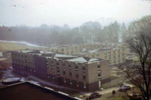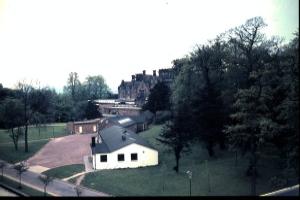 Photo left: The road passes huts towards Keele Hall and the Refectory sits to the left of Keele Hall. Graham Fisher (1965)