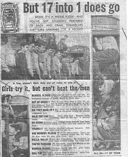 "I was involved in this - see attached press cutting which unfortunately I did not date. Probably the Evening Sentinel but I seem to remember that the national press was also involved. The aim of the stunt was to beat Manchester University's record of 16 in a telephone box. I think the year was 1959. I remember that the organiser(s) of the stunt - Lee Lyas (?) (1961), Ticker Hayhurst (?) (1960), and Jerry Rivers (?) (1959) persuaded the GPO to provide a red telephone kiosk which arrived on a trailer and was winched upright. The kiosk had no fixtures or fittings so have never been sure if Keele's supremacy (17 in the box) over Manchester was entirely fair! Colin Christmas was first into the box followed by me, Peter Didcott (1962) and Colin Thomas (1962) plus thirteen others including John Lowe and Bob Mantle. It is possible that the stunt was also connected to the Keele Rag. The girls' team also had a go but only managed 13."