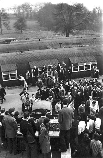 "Here is a photo of the Keele attempt at the maximum number in a phone box for the Guinness Book of Records — I think that was the purpose. The location was just up from the original Union Hut (the black huts in the background). It was not just a prank by a few. On the day, I think there was a fairly casual search for anyone small nearby to be part of the attempt. So it must have been quite well advertised, though not highly organised. Being over 6 feet tall, I was not likely to be a candidate for being part of it. The caption on my photo says ’17', so that was probably the result - seventeen people in the phone box. I think they had more than one go-to pack the box. I seem to recall that it did not achieve the world record. It might be Peter Didcott (1962) in the centre foreground, with the duffel coat. It might have been as early as 1959 as I certainly had no role (as a fresher or early second year) and I was a little more prominent after that but it was probably about 1960. I believe I took the photo. Certainly, the view is from where I watched. This incident might have been covered in the local paper, The Sentinel, but I do not recall seeing a report. In fact, we rarely saw the paper. People who might know more are Colin Thomas, Moray Stewart, Peter Didcott, and possibly Bill Robinson."