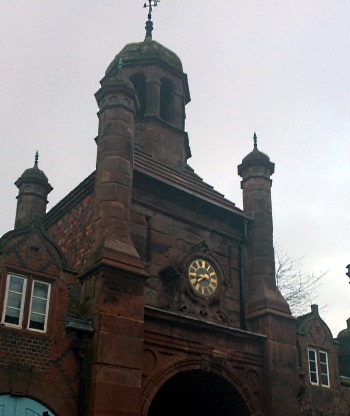 The new clock face was photographed on its very first day by previous Vice-Chancellor Professor Trevor McMillan; it is, after all, right outside his front door. His photo on the right is a little fuzzy as it was a misty February morning but this was genuinely the very first dawn of the new Keele clock!